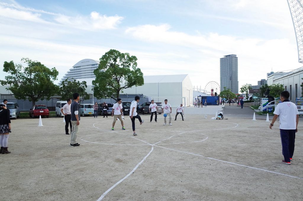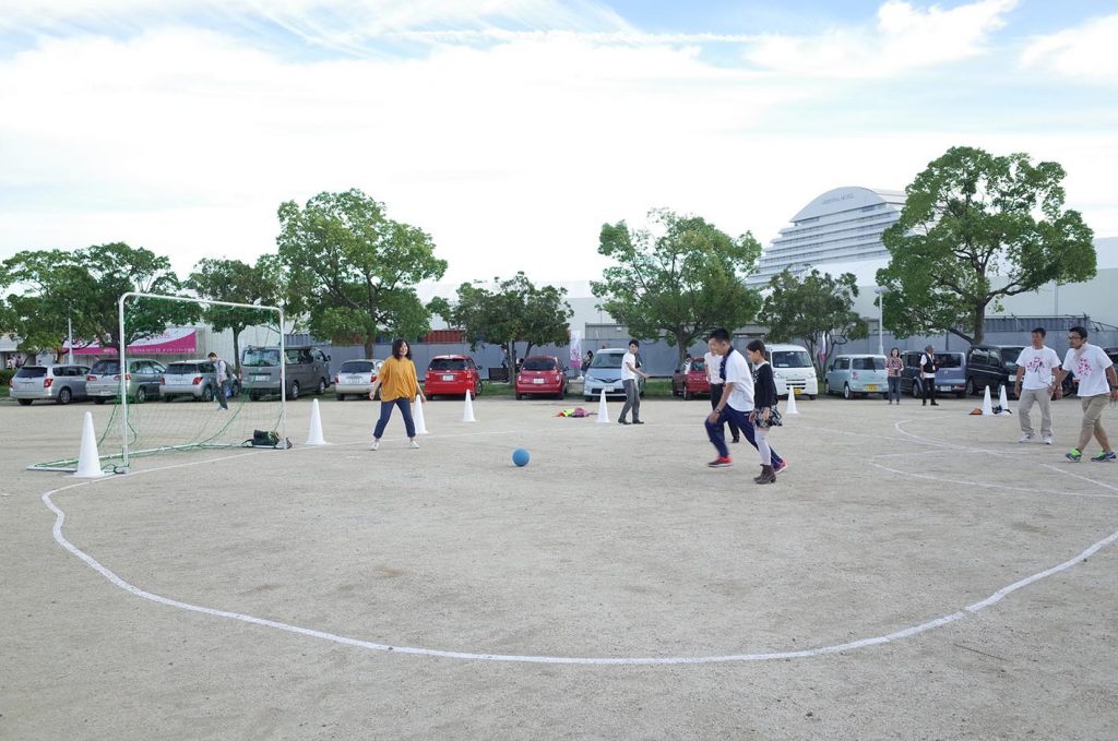 2015年9月20日、神戸ビエンナーレの展示会場の中で、自由な形のサッカーコートをみんなで描き、サッカーをするワークショップを行いました。最初から積極的に取り組んでくださり、最後は思いっきり体を動かして楽しみました。