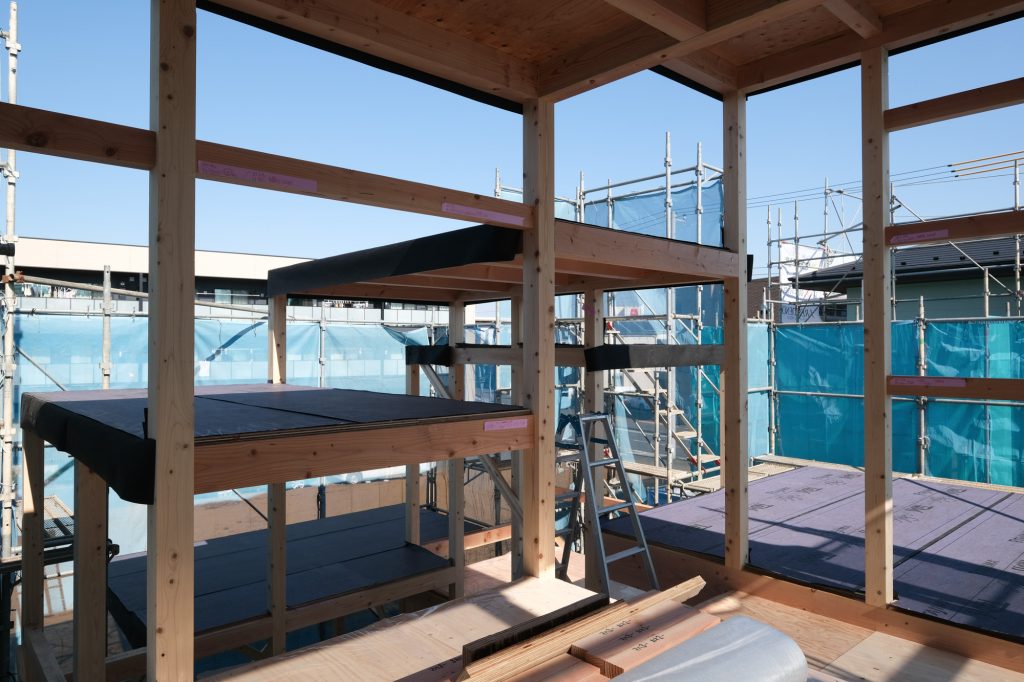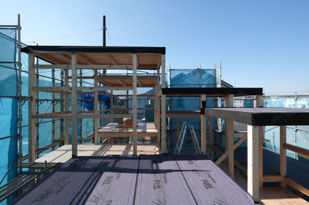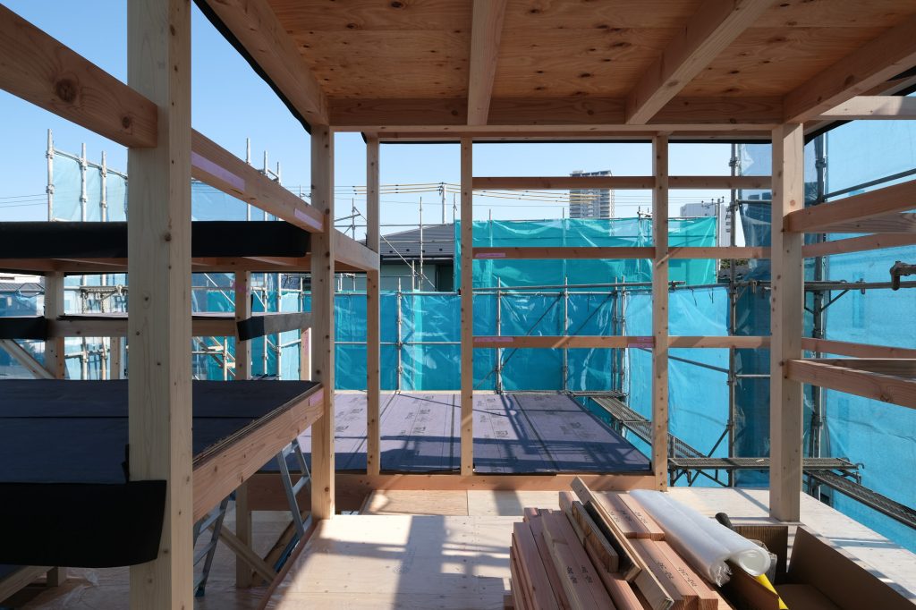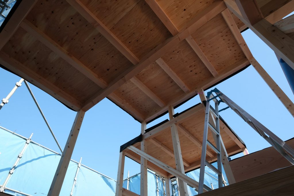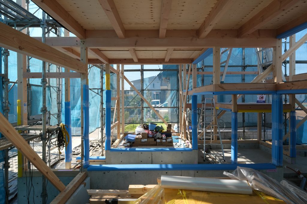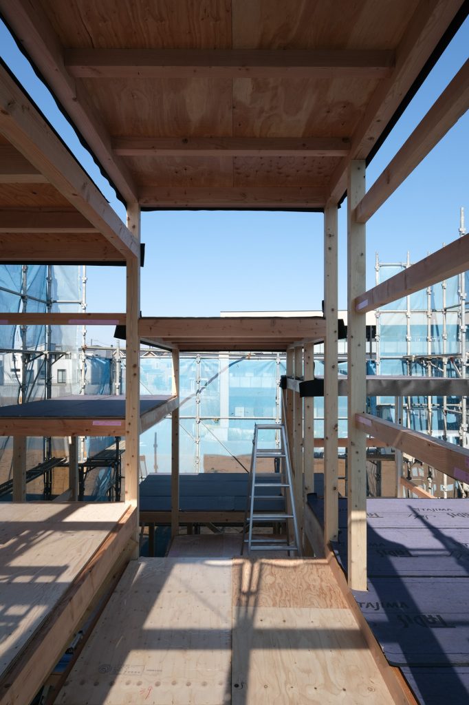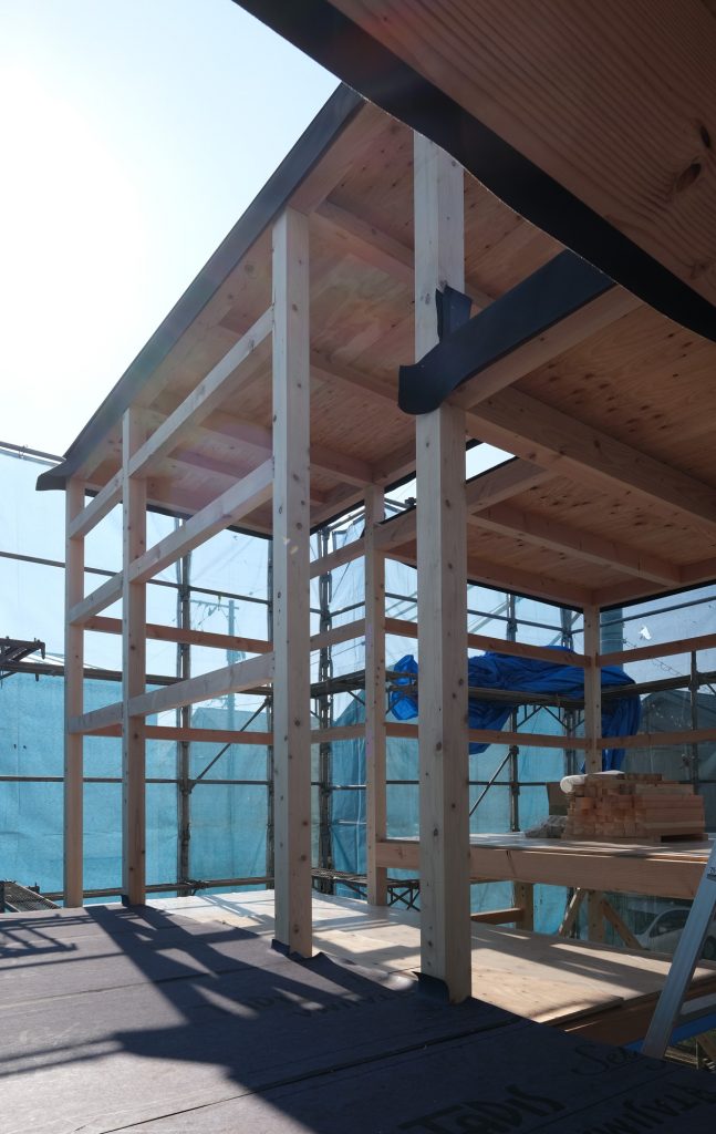 「床と光の家」が上棟しました。浮遊する床が軸組と共に現れ、空間が見えてきました。
