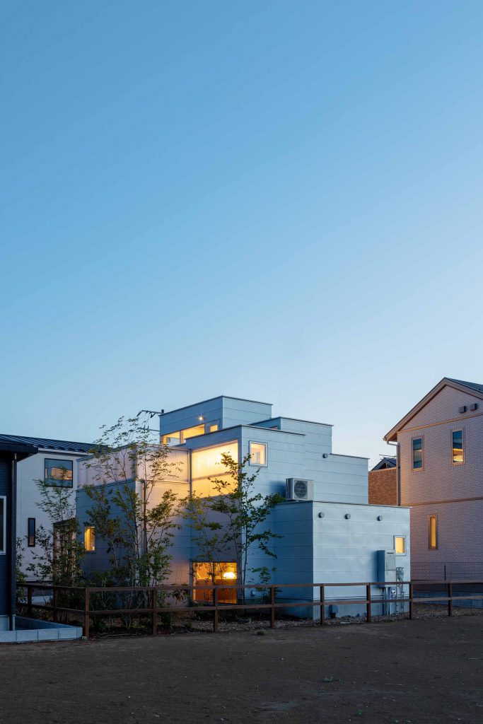 夫婦と子供の3人家族の住まいである。敷地は、千葉県八千代市のニュータウンの一角。最近まで畑や林などが残っていた地域で、周囲はまだ更地が広がる。夫は家全体がワンルームのように繋がり光に溢れた住まいを望み、妻は収納が多くプライバシーを保つことができる住まいを望んだ。両極端のリクエストを実現するため、立体的なワンルームとすることで地面と空を家の中に取り込み、環境と人とものの関係性を、床の段差によって構築した。