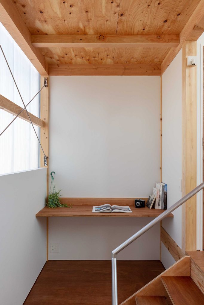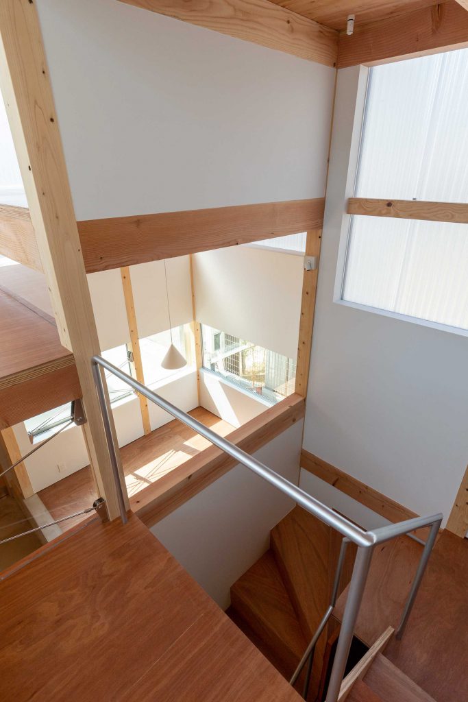 今後周囲に住宅の建つことが予想されるので、開口部は外壁側に多く取らず、ミルフィーユ状に床と床の隙間を光の取り入れ口とし、外壁は、断熱性に優れたポリカーボネート中空板で帯状に覆うこととした。プライバシーを保ちながら、内部まで光が入る。また、人の背よりも高いところに透明なハイサイドライトを帯状に回し、通風と視線の抜けをつくった。リビングのソファから見上げると、折り重なる床の先に空が見える。高さの異なる6つの木の床とコンクリート土間は、平面的な広さとしてはコンパクトな家の中に、感覚的な距離を生む。これらが生活の中で展開されることで、家族の繋がりが床を媒介として一体となりつつ、のびのびとした広がりを感じさせる住宅とした。
