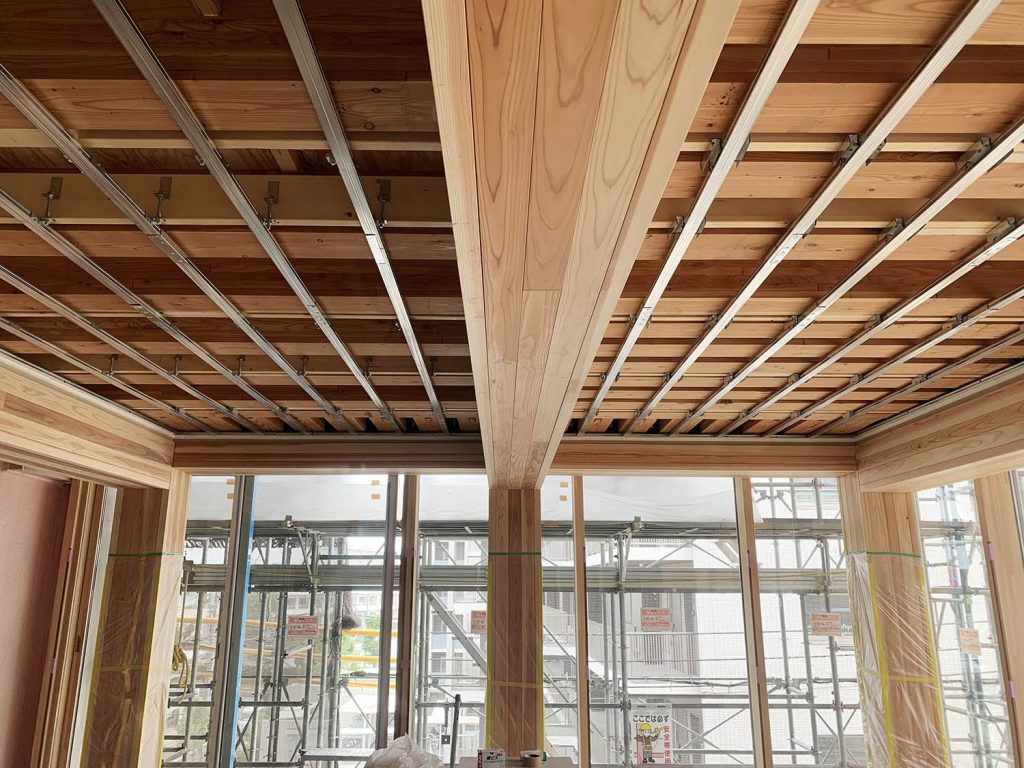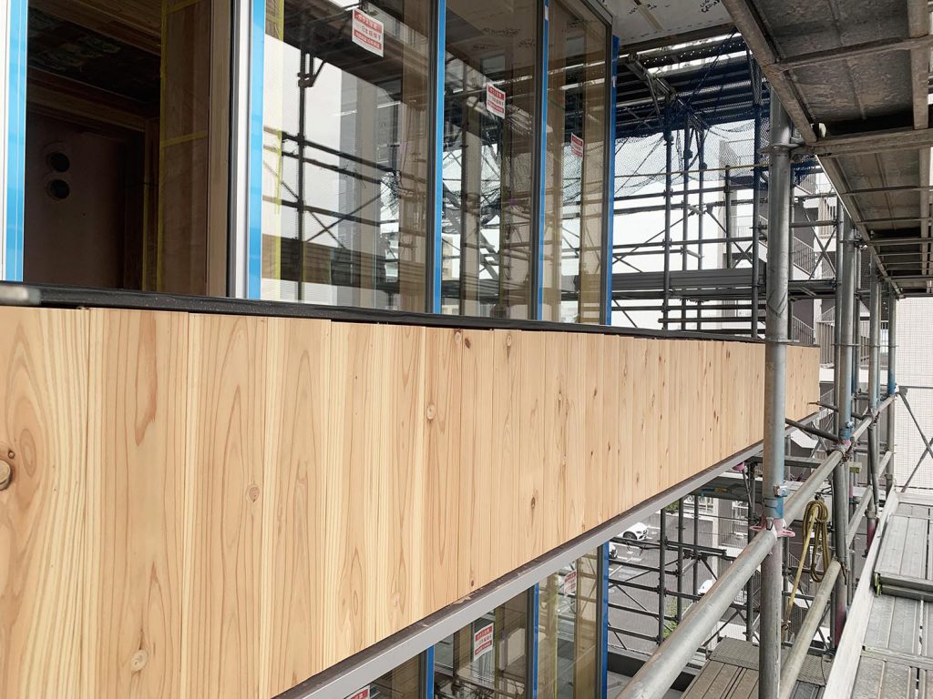 外周にアルミ+木複合カーテンウォール、スラブ小口外壁の木板張り、内装の下地・ボード張りが着々と進んでいます。