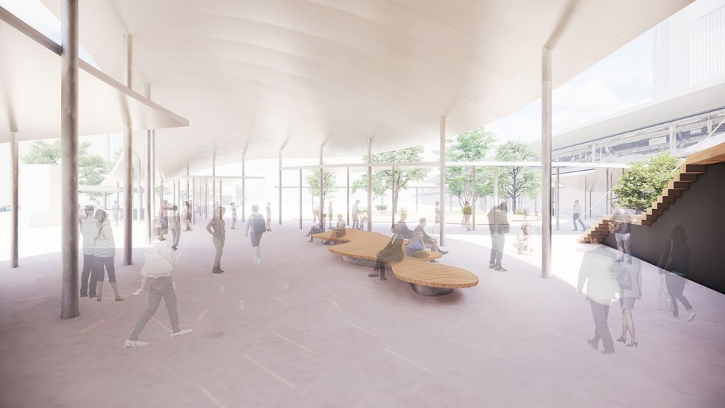 動きと流れのある屋根下空間は、植栽や集いの場と相互に浸透し合って、一体的で開放的な広がりを持つ。