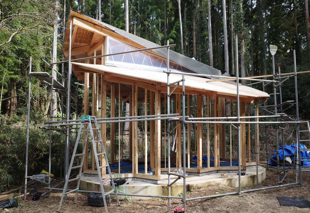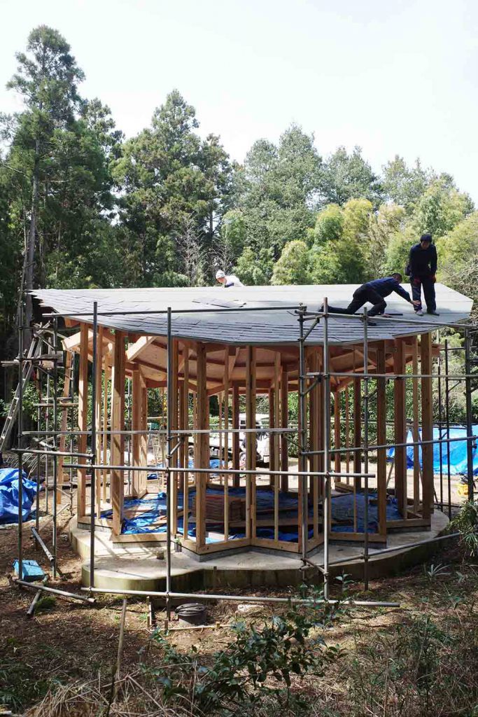 「森の書庫」の屋根材シングル張り葺きが始まりました!防水メーカーの方に指導役として現地に来ていただきました。屋根の野地板にシングルを並べて、屋根がクタッと下がる見え方にならないように、伸びやかに見えるような貼り方(意匠)と雨水の落ち方(機能)をみんなで考えながら、貼り方を決めていきました。決まった貼り方をチョークのラインで書き込み、そのラインに沿って葺いていきます。「寺院建築など伝統的な反り屋根と通じる貼り方」と防水メーカーの方よりコメントいただきました。