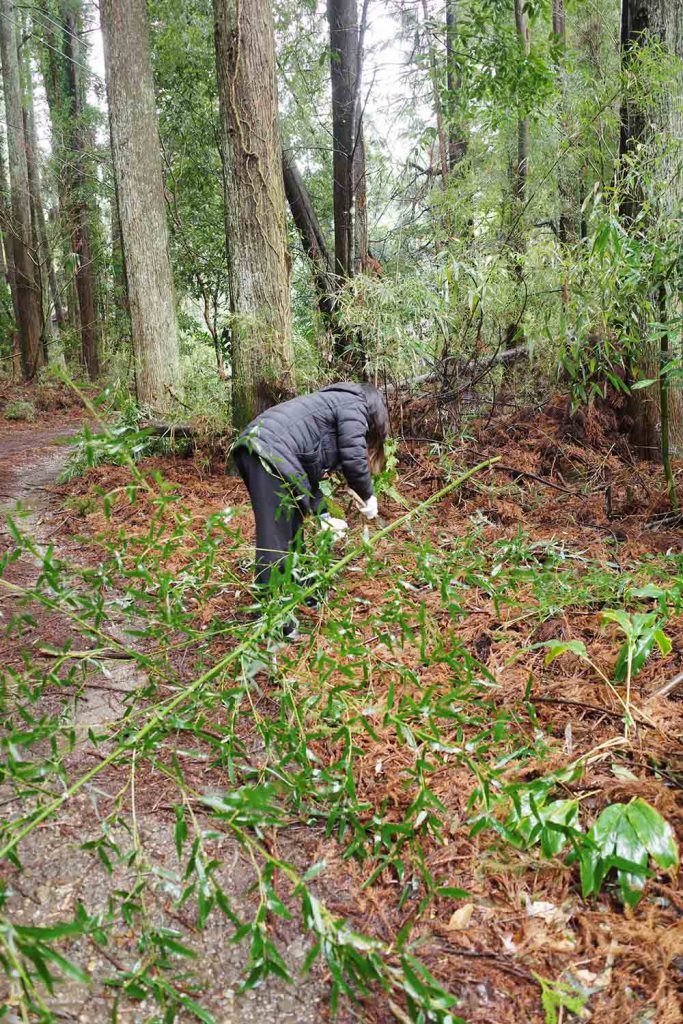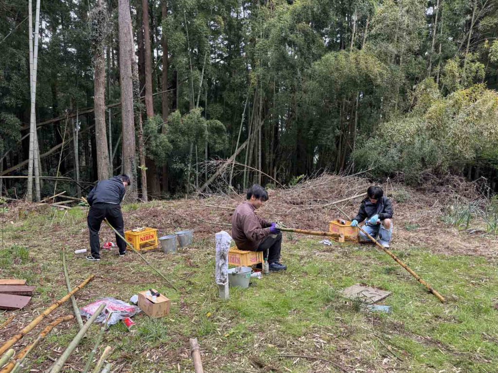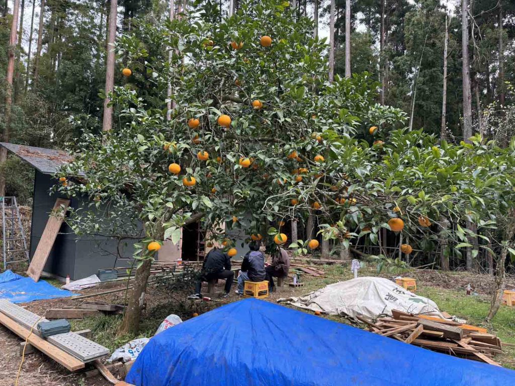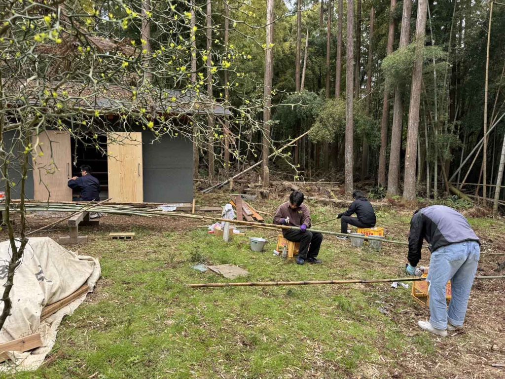 クライアントは、周辺に竹林が広がるこの地で、毎年筍掘りを楽しんできました。この背景から、棚の脚として、周辺の竹を伐採して使うことにしました。竹細工職人の東浩章氏より竹の取扱い方法をアドバイスいただきました。竹の表面を火で炙ると、油が滲んできて、竹表面のガラス質がなくなり、竹が呼吸できるようになるそうです。これを油抜きと言い、油抜きの後、天日でしばらく干すと、一番長持ちして使える状態になるそうです。学生ボランティアの協力で、竹の伐採と油抜きを3日間に渡って行いました。