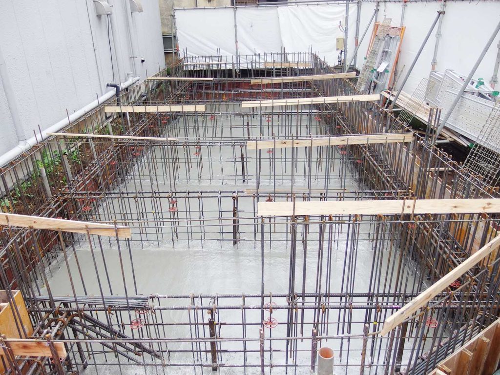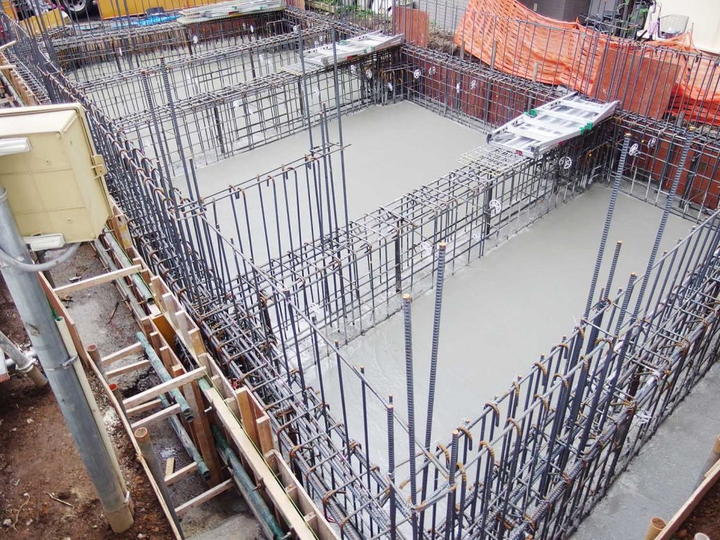 あまりの暑さに、来られる予定だった職人さんの一人が熱中症にかかってしまいました。 そのため、急遽施工会社の社員のみなさんも加わって土間コン押さえをする、というハプニングがありましたが、無事土間コンクリートの打設が完了しました。