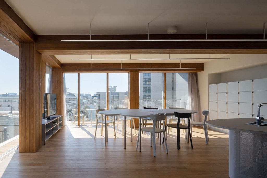 長谷工コーポレーションによるRC造の耐火建築物に、4層の耐火木造を挿入するという試みである。学生棟の住民が共用で使うキッチン・リビングとして、木造の家の持つ温かさと、未来へ向かう明るく爽やかなイメージをめざした。構造は、柱梁に耐火認定部材を使用した、木造の軸組によるシンプルな架構である。耐火建築物であることから、層間区画は床スラブを伸ばしたスパンドレルとし、外部に面した二面は採光面を最大限確保した。スラブは階によって交互にせり出し、外部テラスとなっている。