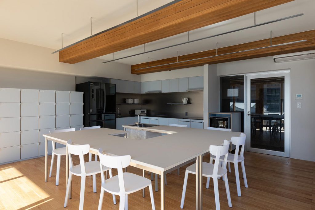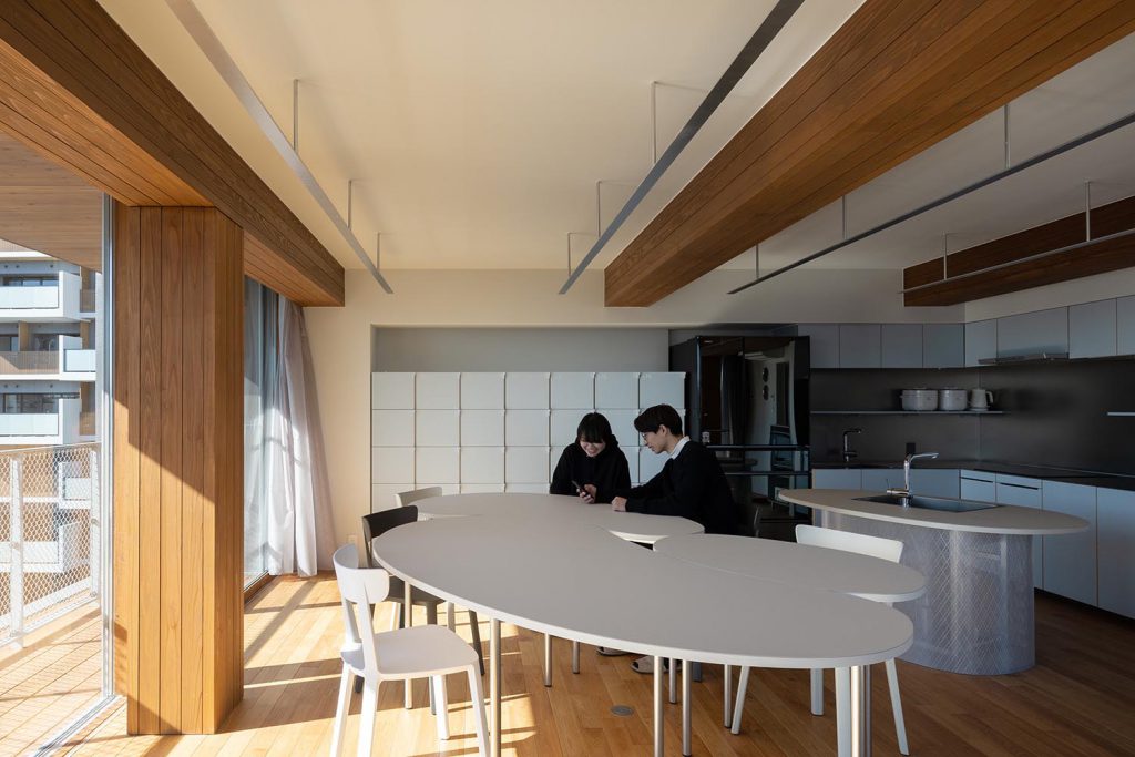 内部は、個人で食事をしたり、みんなが団欒を楽しめたりできるよう、自由にレイアウト変更のできるフレキシブルな家具を置くこととした。集まって暮らす楽しさを体験できるような、大きなテーブルが中心に据えられ、距離を取りつつもお互いの顔を見ながら食事ができる。キッチンとは別に、シンク付のテーブルを設けることで、食事をする人と洗い物をする人が一緒に過ごすことができる。