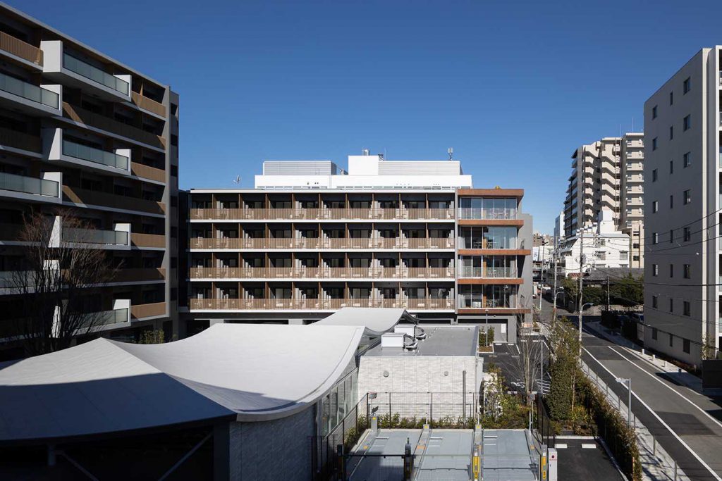 赤羽駅からほど近い敷地にたつ、長谷工コーポレーションが手掛ける、共創型レジデンス「コムレジ赤羽」。「社会人棟」「学生棟」「賃貸棟」の3棟からなる大規模な複合施設である。コの字形に構成された本体棟(長谷工による設計・施工)の中庭に、3棟の住民が共用で使うカフェテリア棟と、学生棟の4層木化リビングルームを、私たちが設計・監理した。