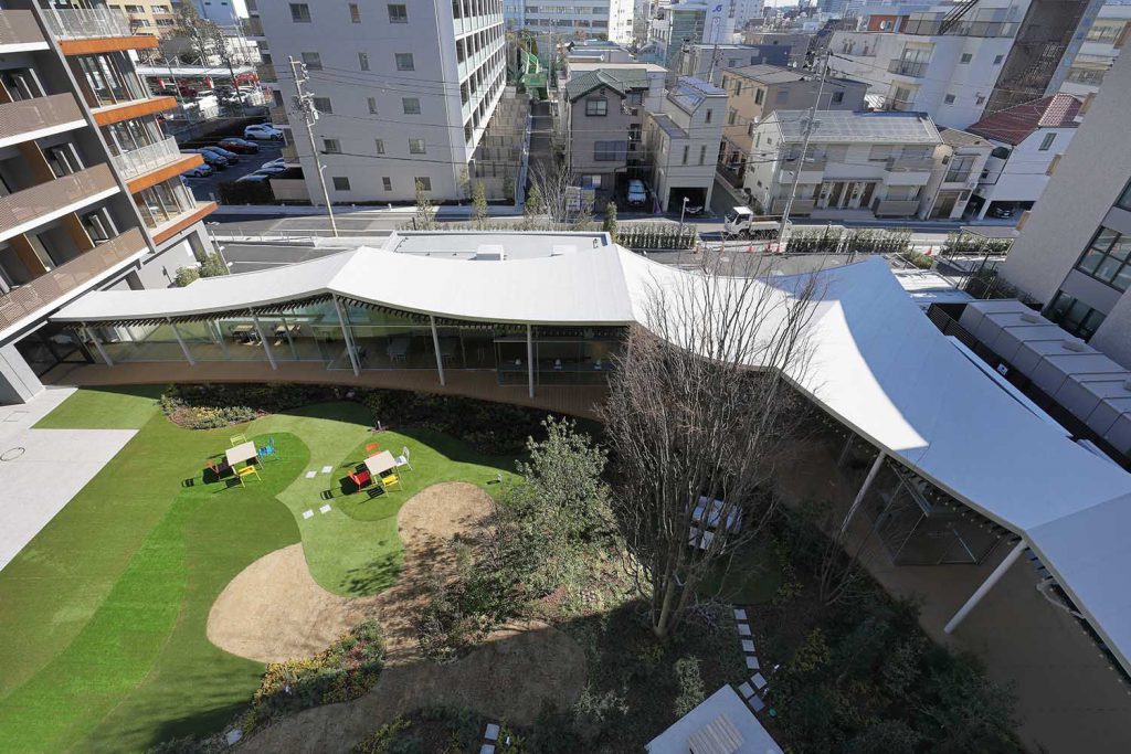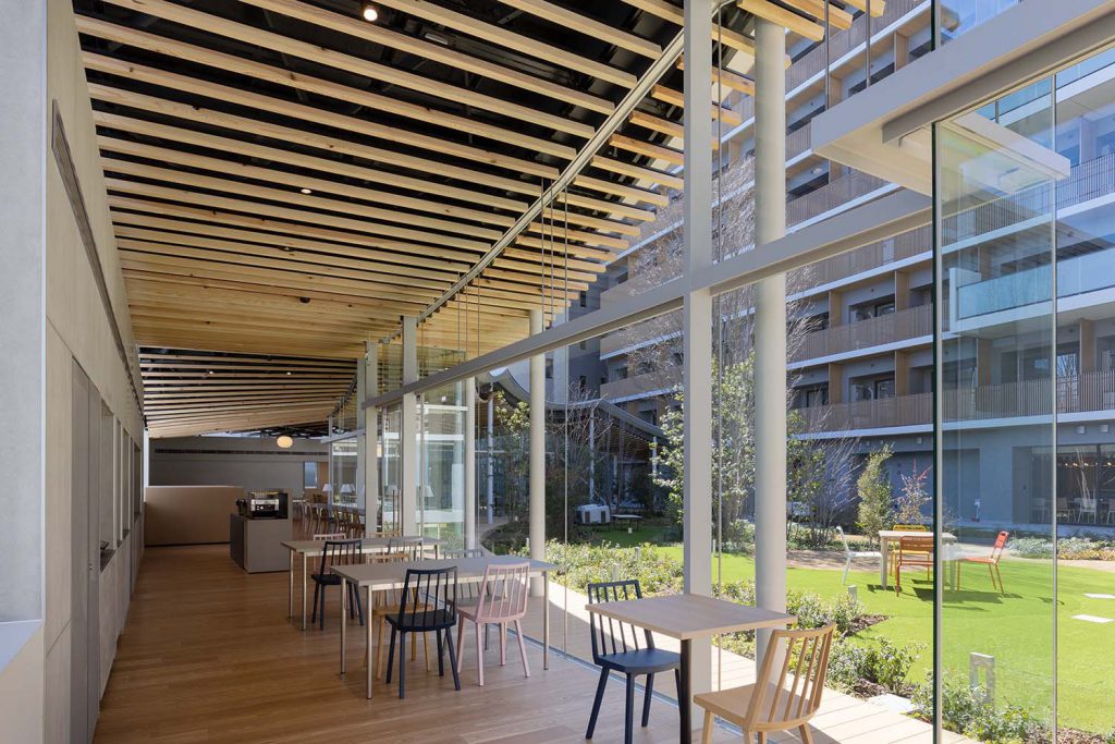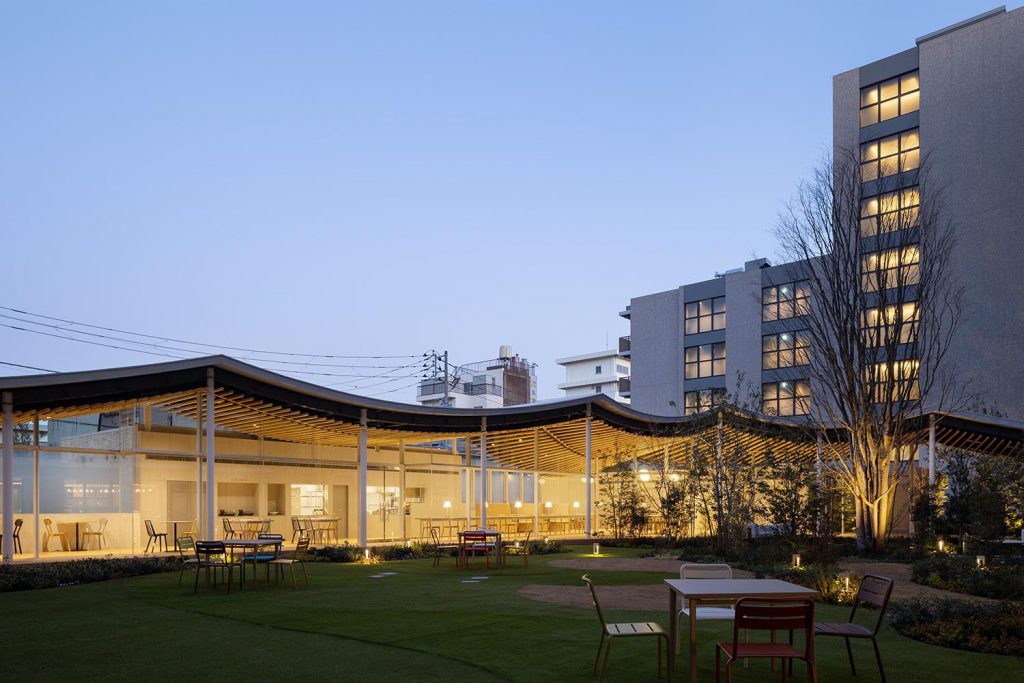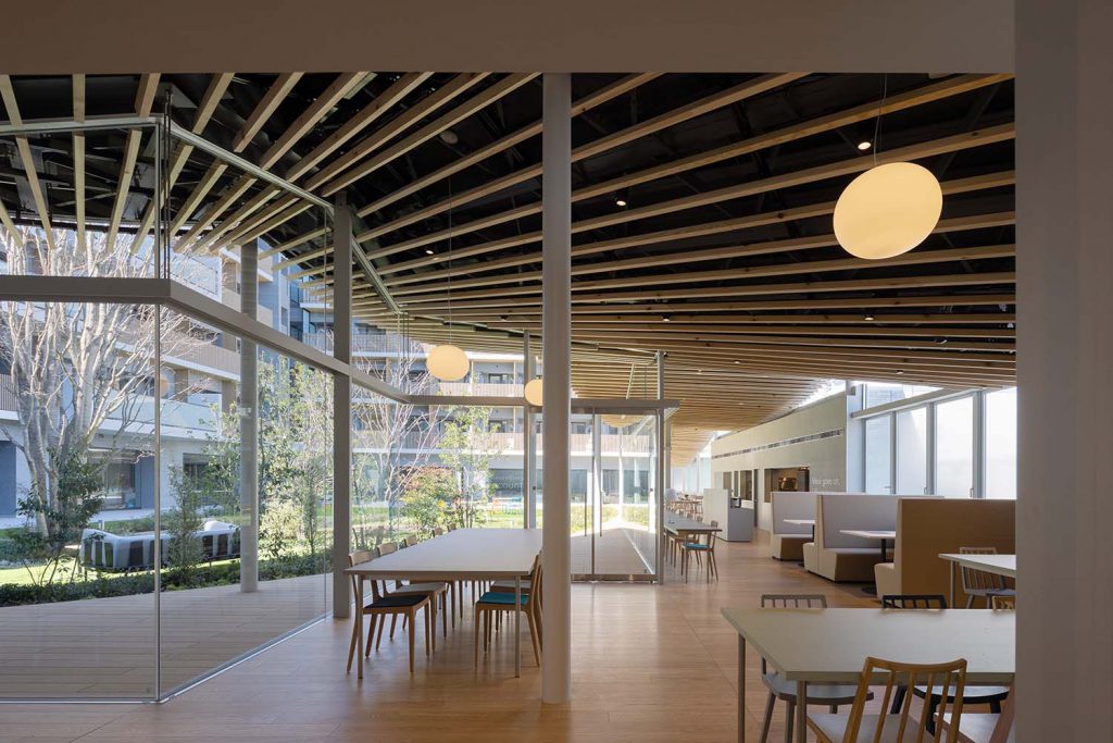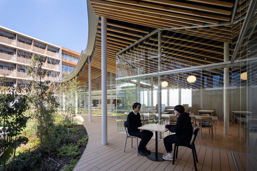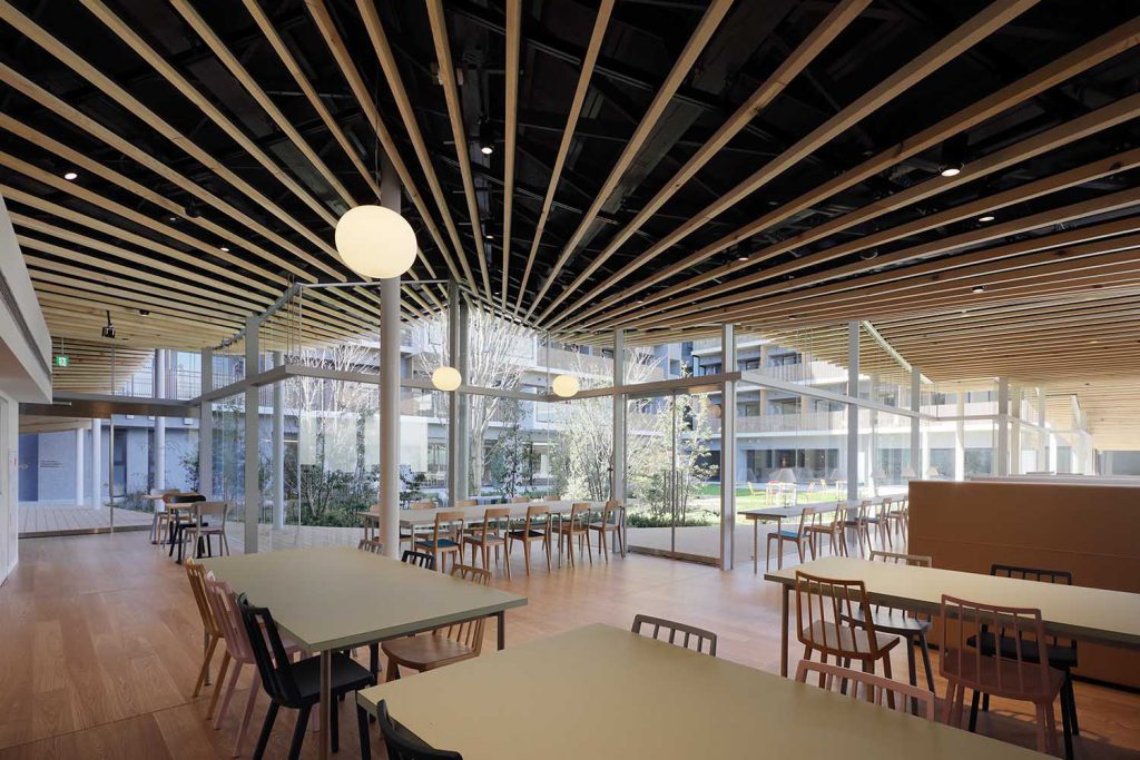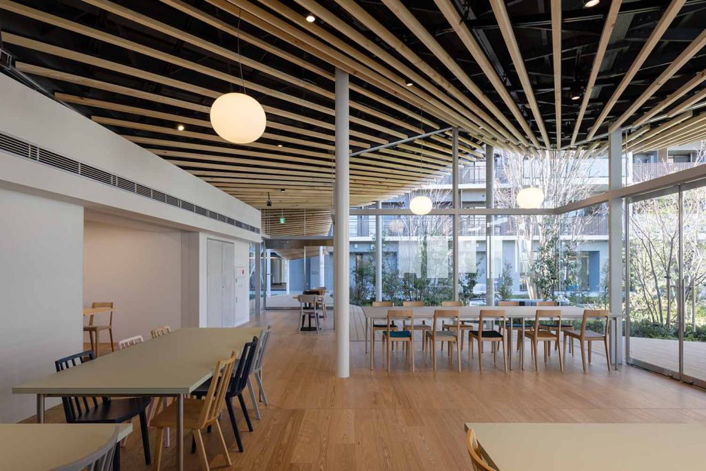 カフェテリア棟は、社会人棟と学生棟をつないだ回廊状の空間が、そのままカフェテリアの空間となる。人の行き来する動線を溜まりの空間と兼ね合せることで、広い中庭を生み出した。カフェテリアは、中庭に面しておおらかな円弧を描き、それが社会人棟と学生棟をつなぐ縁側空間となっている。比較的高密度なレジデンスの中で、明るさと、緑を間近に感じることができる場所にするため、軽やかな波打つ屋根をかけ、中庭に対して開かれた建築とした。3棟のどの住戸の中から見下ろしても、シンボリックで親しみのある屋根であり、開放的でのびやかなイメージとなった。