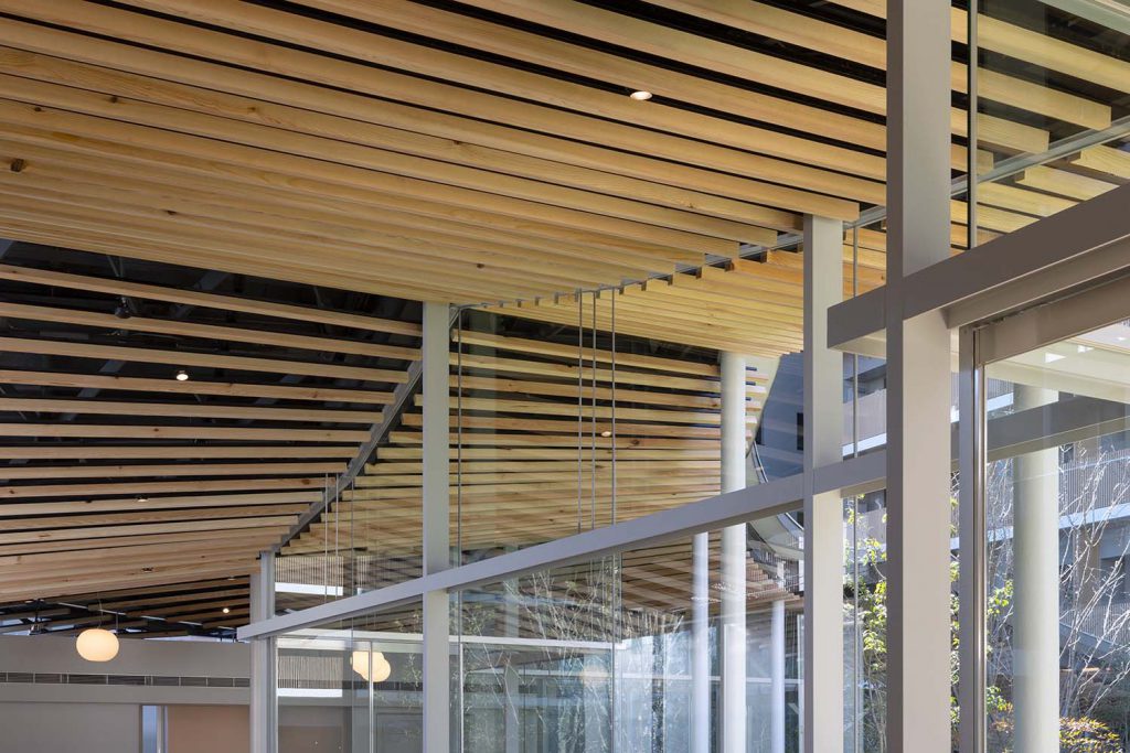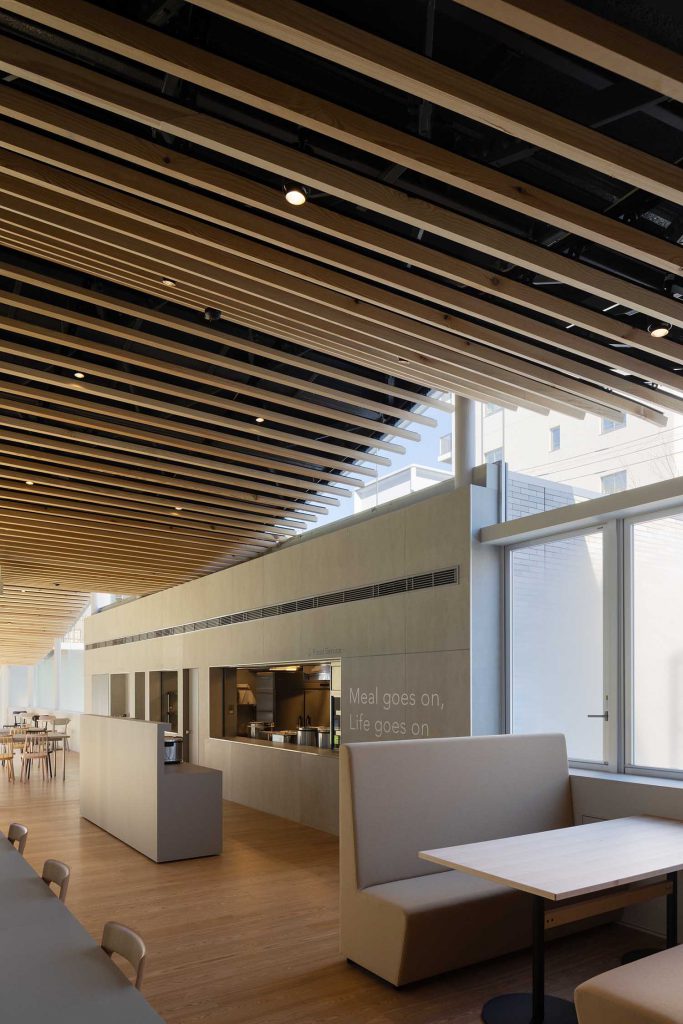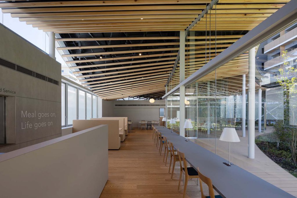連続した5枚の曲面屋根は、円錐面と円柱面のみで構成し、無理のない施工性を確保している。接続部から建物中央に行くにつれて平面・高さ方向ともに広がっていき、リズミカルな波打つ屋根による効果が相まって、適度な分節感と一体感、開放感をあわせ持った空間となった。ガラス面を矩形状に雁行させることで、様々なまとまったスペースを生み出し、ひとつながりの三角スペースが縁側に多様な場をつくる。軒と天井を形作る木ルーバーは、内外全体を包み、やわらかな変化とあたたかみをカフェテリア全体に与えている。