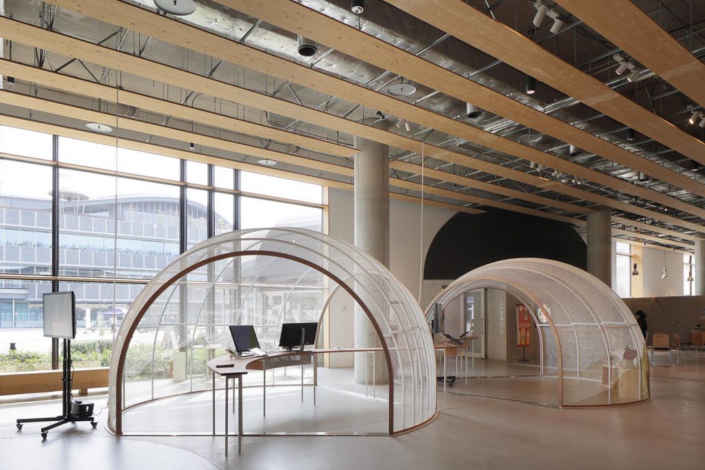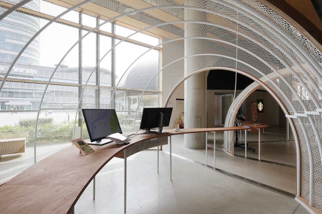 岐阜の豊かな川の文化を象徴する「清流長良川の鮎」。コクーンは鮎を獲る漁師の網と見立てることもでき、有機的な建築空間と呼応し、岐阜の未来を象徴する空間となる。コクーンは、まずスチールパイプφ27を半円状に曲げて1つのフレームとし、高さの異なる8つを横繋ぎ材で連結してドーム形状とした。このフレームにネットを二枚重ねて、スチールフレーム+二重ネットの構成としている。フレームは施工性等の合理性を加味すると幾何学上の球体となるが、建物2階にあるグローブの様に有機的な形態となることを目指し、やわらかさを合わせ持つフレーム形状とした。