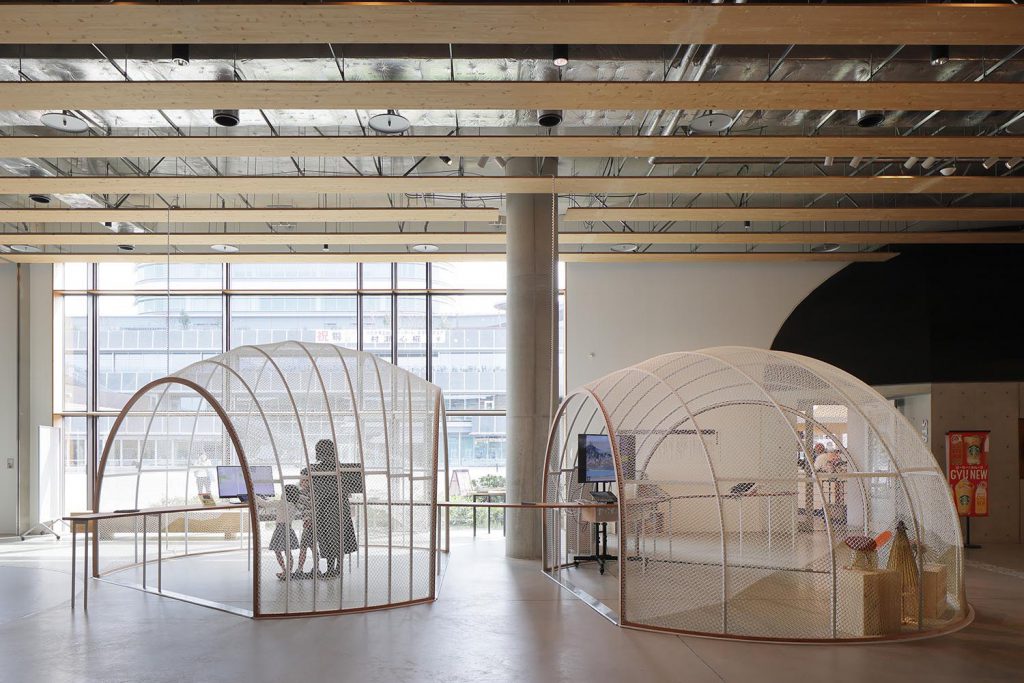 岐阜の魅了を発見・編集・発信する場として、地域の伝統を生かした空間デザインを提案した。中央には「長良川カウンター」が置かれ、情報端末を設置する。それを覆うように、ネットに包まれたドーム形状の空間「金華山コクーン」を配置し、「歴史テーブルエリア」と「街歩きエディターエリア」とした。